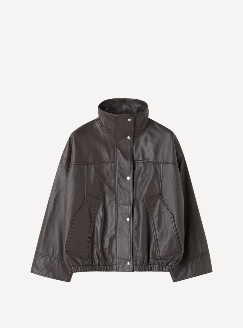 En bomberjakke i blødt læder med et klassisk snit og et eksklusivt udtryk. Silhuetten er afslappet med sænkede skuldre og en markant ståkrave, der giver jakken et cool og ubesværet look. Trykknaplukningen gør den nem at style til hverdagsbrug, mens pasformen er designet med et let oversized udtryk – her båret en størrelse større for ekstra volumen. - Dame > TØJ > OVERDELE > JAKKER - Reinvented leather jacket | Earth - 36