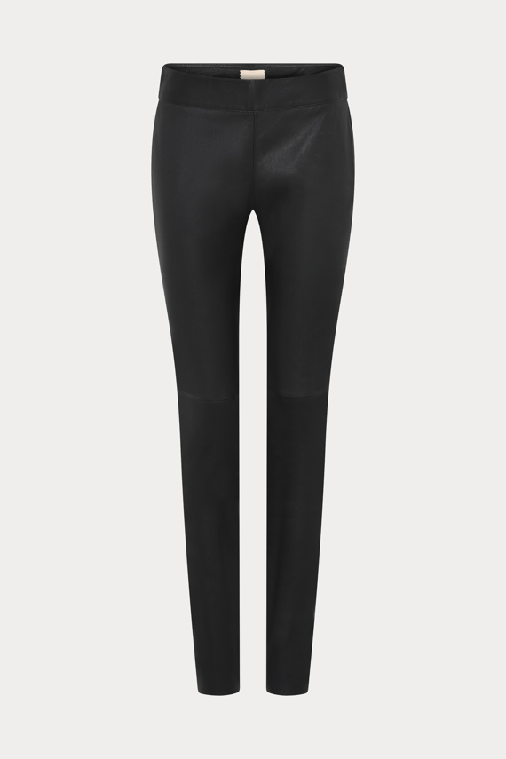 Libertiner pants er elegante læderbukser i 100% lammeskind, der kombinerer luksus og komfort med en smal pasform og enkel taljekant.