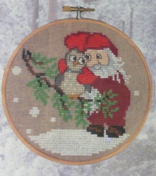 Juleophæng, nisse og ugle, ø13cm, mønstre, garn, nål, stof hør 10 thr. pr.cm.