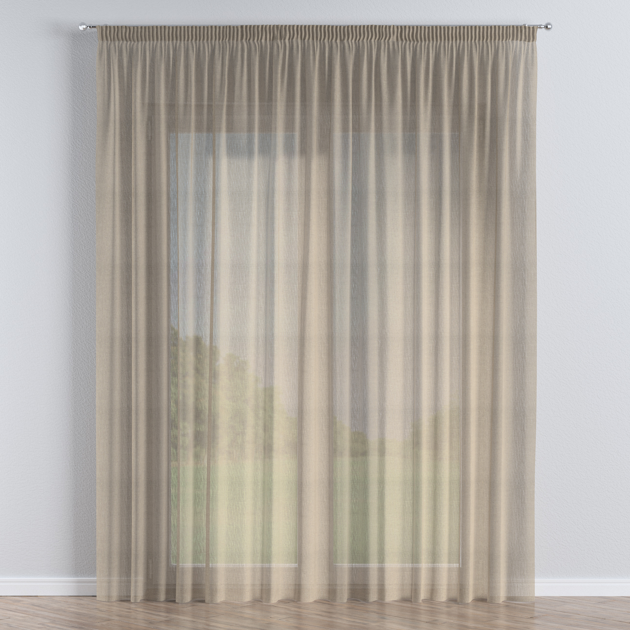 VoileGardin med rynkebånd ✔ Skræddersyet - klar til montering hos dig✔ Direkte fra systuen - uden fordyrende mellemled✔ Perfekt fald - med indsyet tyngdebånd og ekstra tyngde i hjørner ved søm✔ Kvalitetstekstiler – hovedsaglig fra Portugal✔ EU produceret - vores egen systue Mål og bestilling Længden måles fra undersiden af gardinstangen, og det er bredden før rynkning, der skal angives. Du kan vælge at bruge de nederste "lommer" i rynkebåndet til gardinkrogene, så gardinet bliver løftet ca. 15 mm. Da skal du tillægge 15 mm i længden. Bredde og rynkning En gardinbredde på 130 cm formindskes til 65-100 cm efter rynkning. Montering og anvendelse Bruges til gardinskinne og små gardinkroge, som ikke følger med. Da rynkebåndet er åben i hver side (løbegang), kan gardinet dog også bruges til en gardinstang uden glidere. Tolerancer Størrelsen vil altid have en tolerance på +/- 5 cm i bredden og +/- 2 cm i længden. Stoffets bredde og sammensyning Vores voilegardiner vil aldrig blive syet sammen af flere stofbaner, da vores voiletekstiler har stofbredder fra 290cm og bruges horisontalt. Hvis du skal bruge gardiner længere end 285cm, så kontakt os. Afslutning og tyngdebånd Gardiner afsluttes forneden med en søm med indsyede tyngdebånd eller alene med tyngdebånd som skaber de mest jævne folder. Ved lange gardiner kan du med fordel bruge denne gardin-fører stang