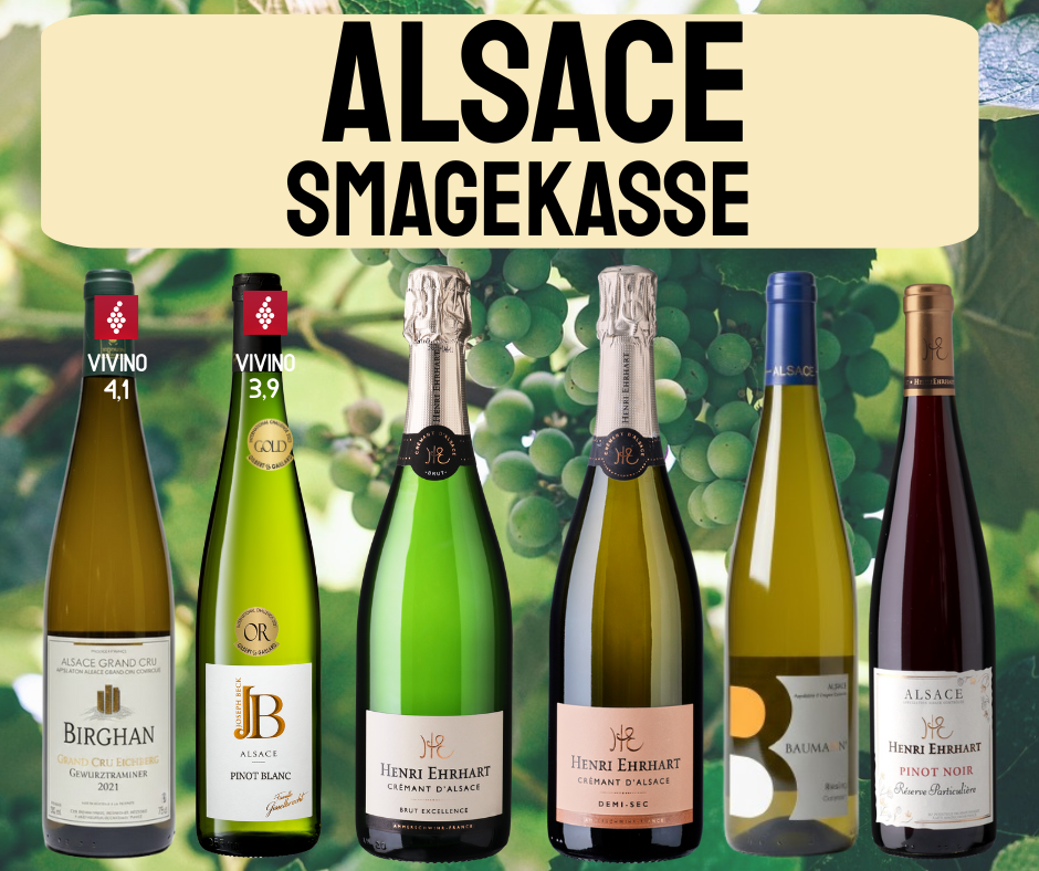 6 FLASKER RIGTIG LÆKKER ALSACE VIN! ★★★★★★ 6 FLASKER LÆKKER ALSACE VIN ! KUN 499,- PR. KASSSE. NYHED! Vi har lavet en LÆKKER ALSACE SMAGEKASSE med 6 flasker rigtig, rigtig god vin til KUN 499,- pr. kasse. Det er alle super populære vine! Se lige disse super skønne og meget populære vine, som alle byder på en dejlig smagsoplevelse. DU SPARER HELE 535 KR. I FORHOLD TIL DE ENKELTE FLASKERS VEJL. STYKPRIS. Vinkassen indeholder følgende vine: 1 FLASKE Alsace Riesling Collection Baumann 2020 11,5% 1 FLASKE Alsace Pinot Blanc 2023 Joseph Beck 1 FLASKE Alsace Birghan Grand Cru Eichberg Gewurztraminer 2021 75 cl 1 FLASKE Henri Ehrhart Crémant d'Alsace Brut Excellence 75 cl. - 12% 1 FLASKE Cremant D´Alsace Demi-Sec Henri Ehrhart 75 cl. 1 FLASKE Henri Ehrhart Pinot Noir Alsace 75 cl. 2023 Alsace Riesling Collection Baumann 2020 11,5% (vejl. 119 kr.) Denne vin fremviser det klassiske for Alsace Riesling med en kompleks, indbydende bouquet af citrusfrugter som lime og grapefrugt, blandet med florale noter og mineralske træk fra signaturdruen, Riesling. Smagen er struktureret med en levende syre, flot balance og friskhed, hvilket skaber en vin, der både kan drikkes ung og lagres med gevinst. Typiske smagsnoter inkluderer grønne æbler, hvide blomster, citrus, samt en markant mineralitet, der giver en ren og vedvarende finish. Alkoholniveauet på 11,5% holder vinen rank og elegant, og vinen er typisk tør eller let halvtør med rigtig madvenlige kvaliteter. Alsace Pinot Blanc 2023 Joseph Beck (vejl. 139 kr.) ★★★★★ VIVINO 3,9 ★★★★★ Gilbert & Gaillard - GULD Joseph Beck Pinot Blanc fra 2023 en virkelig behagelig, afbalanceret hvidvin lavet udelukkende på Pinot Blanc druer fra Willy Gisselbrechts vinmarker i Damback la Ville i skønne Alsace. oseph Beck Alsace Pinot Blanc har en elegant gylden farve med en flot klarhed i glasset. Duften er frisk og mineralsk med noter citrusfrugter og hvide blomster. Det er en fin og elegant hvidvin med en velafbalanceret, harmonisk og delikat smag. Den besidder en god friskhed og flot lethed. Alsace Birghan Grand Cru Eichberg Gewurztraminer 2021 75 cl (vejl. 199 kr.) ★★★★★ VIVINO 4,1 Det fås ikke bedre – blød, harmonisk og meget elegant. Kan sagtens drikkes alene – ellers passer den perfekt til aperitifs, desserter mv. Birghan er beliggende i Alsaces højest beliggende vinområde – Husseren Les Chateaux – tæt på Eguishem og her produceres nogle af de bedste vine i hele Alsace, og de 300 meter over havoverfladen medfører at vinene der produceres her opnår en unik aroma og stor fylde. Siden 2020 har Birghan fået tildelt HVE (High enviromental value) – der betyder at deres produktion er særlig skånsom over for miljø og omgivelser. Henri Ehrhart Crémant d'Alsace Brut Excellence 75 cl. - 12% ( vejl. 199 kr.) Fine og elegante bobler med en frisk duft af hvide blomster og citrus. Moussen fornemmes blød og frisk med noter af æbler og grønne druer. I smagen fornemmes indledningsvis noter af citron og grape, kombineret med fersken og abrikos. En vin med struktur og fylde. En oplagt velkomstvin og særdeles velegnet til lette fiskeretter. Serveringstemperatur: 8-10°C Cremant D´Alsace Demi-Sec Henri Ehrhart 75 cl. ( Vejl. 199 kr.) Vinen er indbydende bleggul med fine elegante bobler med en frisk duft af hvide blomster og citrus. En forførerisk Crémant med fine og friske bobler. En oplagt velkomst vin og særdeles velegnet til desserter. Serveringstemperatur: 8-10°C Pinot Blanc- og Pinot Auxerrois-druerne til denne Crémant dyrkes efter både traditionelle og bæredygtige metoder. Druerne er nøje udvalgt og vinen produceres efter traditionelle metoder. Henri Ehrhart Pinot Noir Alsace 75 cl. 2023( Vejl. 179 kr.) Vinen er rubinrød i glasset med klare aftegninger. Bouquet’en viser tydelige aromaer af sprød, rød frugt. Vinen er kraftfuld og alligevel elegant med silkebløde tanniner. Frugten er harmonisk med dejlig kompleks aroma. Server Henri Ehrhart Pinot Noir til retter med rødt kød, f.eks. en god bøf, eller lammekød, kalv eller marineret svinekød. Serveringstemperatur: 16-18°C Vinene leveres i en alm. vin papkasse. Området: Alsace, beliggende i det nordøstlige hjørne af Frankrig på grænsen til Tyskland, er en af Europas mest unikke og charmerende vinregioner. Omgivet af Vogeserne mod vest og Rhinen mod øst nyder området et særligt mikroklima med mange solskinstimer og beskeden nedbør – perfekte betingelser for vinavl i verdensklasse. Alsace er særligt kendt for sine hvidvine, som ofte er tørre, rene og aromatiske med stor mineralitet og finesse. Regionens stolthed ligger i de ædle druesorter som: Riesling – Sprød, elegant og ofte tør med frisk syre og...