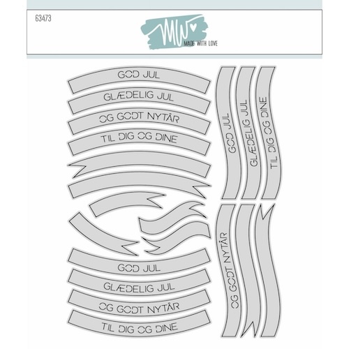 Christmas Banners fra Made With Love indeholder 4 forskellige tekster "God jul", "glædelig jul", "og godt nytår" og "til dig og dine". Hver tekst findes i 3 forskellige banner typer som kan bruges for sig selv eller kombineres med andre tekster eller banner haler for at lave sammenhængende tekst bannere.Tekst bannerne kan f.eks. bruges i kombination med andre tekster, f.eks. en stor glædelig jul tekst, eller brug bannerne til at vikle sig rundt om elementer på kortet.