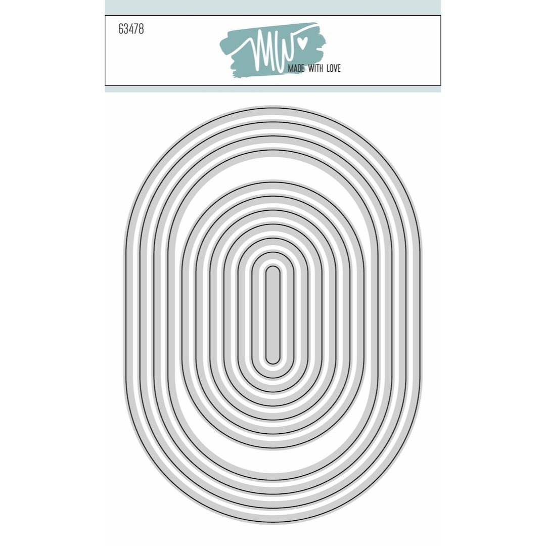 Største 105x148mm A6 Basic Ovals 1 fra Made With Love indeholder 11 ovale dies. 4 i A6 format og 7 i A7 format. Den største A6 måler 10,5x14,8 cm og den største A7 er 6,5x9,5 cm. Kombiner med Basic Ovals 2 (63479) for at kunne lave helt tynde rammer eller lag.