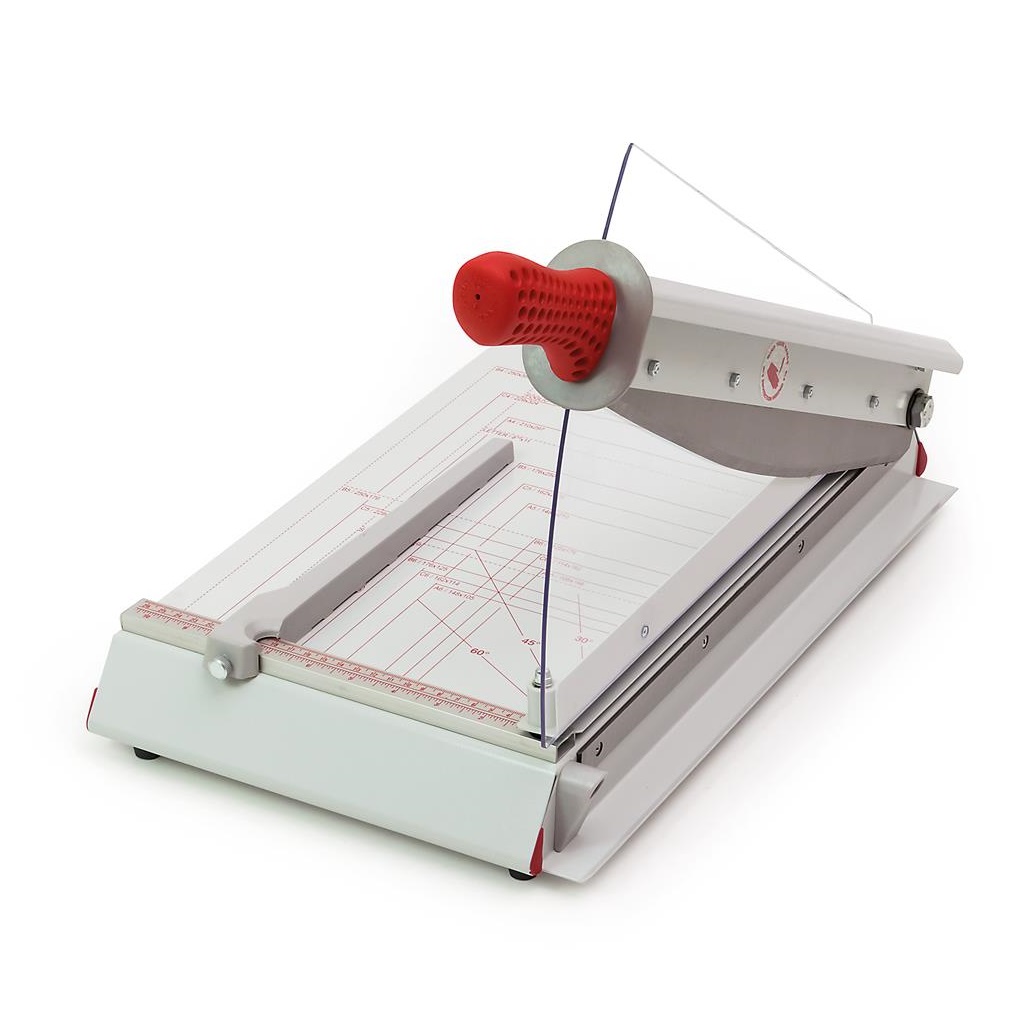 Stærk skæremaskine til mange forskellige skære opgaver. Den praktiske trykskinne og formatlinjer, som gør det sikkert at justere papiret, som skal skæres. Skærekapaciteten er op til 30 ark 80g. De skridsikre gummifødder gør at guillotinen står sikkert fast og er udstyret med et ergonomisk anti-slide håndtag.Specifikationer• Skærelængde: op til 360 mm• Kapacitet: op til 30 ark (80g)• Anlægsbord: 440 x 300 mm• Lodret og vandret målelinial i cm• Gennemsigtig trykskinne holder papiret på plads• Markerede Foto formater på skærebordet• Vinkelmåler fra 30 til 90 grader på skærebordet