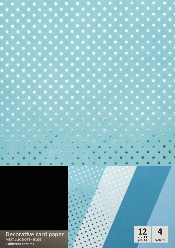 Smukt dekorativt karton papir til mange hyggelige kreative timer med børn, børnebørn eller til søde gaver. Perfekt til dekorationer, indbydelser, gaveæsker, bordpynt og meget andet. Pakken indeholder 6 ark med metalliserede blå prikker og 6 ark i blå nyancer. Karton papiret kan ikke bruges i en printer. Specifikationer• Antal i pakken: 12 ark.• Størrelse: A4 (210 × 297mm)• Materiale: karton papir• Farve: mix blå - metallic dots