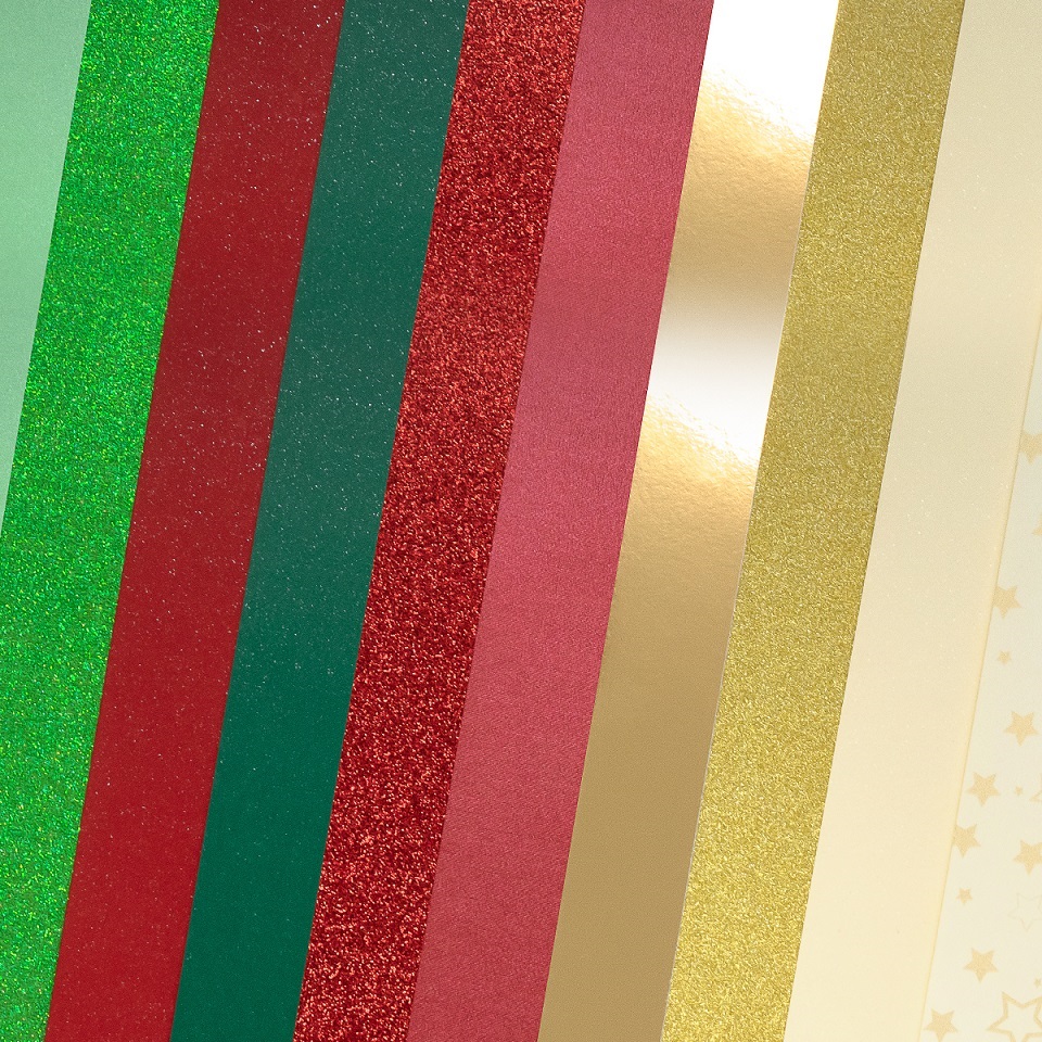 Multipakke med 10 forskellige farver og typer. Perfekt til gør-det-selv projekter og hyggelige klippe klistre timer med børn og børnebørn. Kan klippes og foldes. Kan ikke bruges i printere. Pakken indeholder 6 ark metalliseret karton papir, 2 ark glimmerpapir grøn og rød, 1 ark spejlkortpapir i guld og 1 ark selvklæbende glimmerpapir i guld. Specifikationer• Antal i pakken: 10 ark.• Størrelse: A4 (210 × 297mm)• Materiale: karton papir• Farve: multi