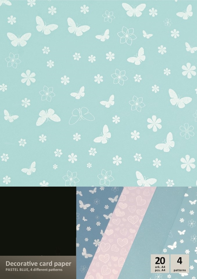 Lækkert kraftigt karton papir med smukke sommerfugle og hjertemønster i metallic finish. Ideelt til gør-det-selv projekter, hyggelige klippe klistre timer med ungerne og mange andre kreative stunder. Kan klippes og foldes. Fåes også i andre mønstre. Kan bruges i laserprintere. Specifikationer• Antal i pakken: 20 ark.• Størrelse: A4 (210 × 297mm)• Vægt: 200/m2• Materiale: karton papir• Farve: mix color