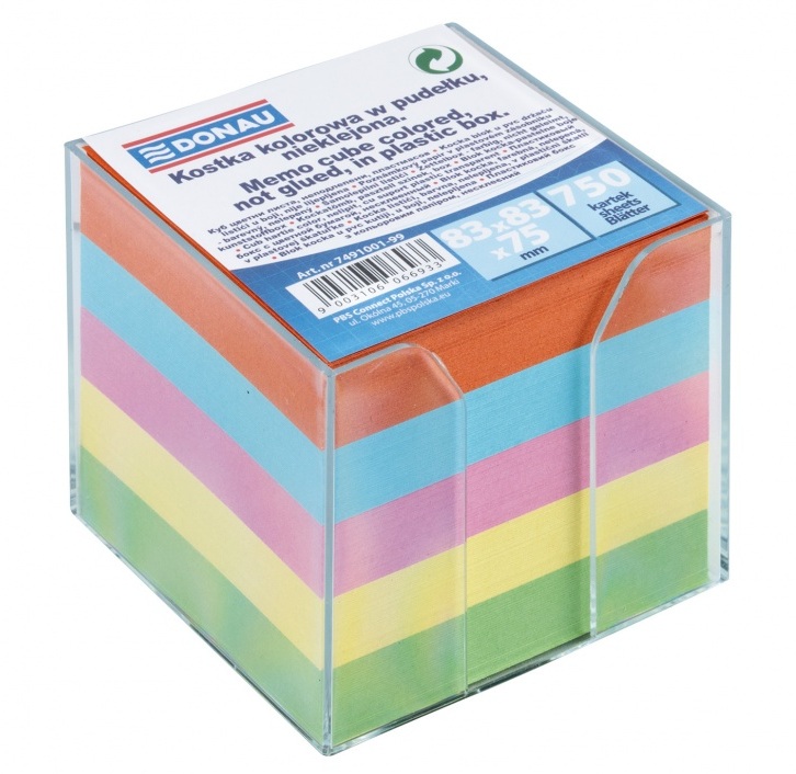 Stabil, gennemsigtig og miljøvenlig kubusdispenser. Arkstørrelse 83x83mm, 750 ark à 70gsm. Holdermål: 95x95x95mm. Ideel til effektiv organisering af notater. Pakket individuelt med 750 ark farvet papir pr. kubusboks.