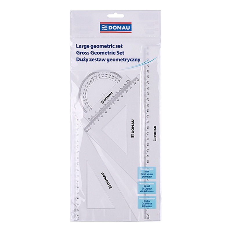 Stort geometrisæt bestående af fire essentielle værktøjer: en 30 cm standardlineal, vinkelmåler og to tegnetrekantsvinkler (60/30 og 45/45) for præcise målinger og tegninger. Emballage er designet med vedhæng, som gør den ideel til butikssalg. • Antal: 4 dele• Farve: transparent (gennemsigtig)