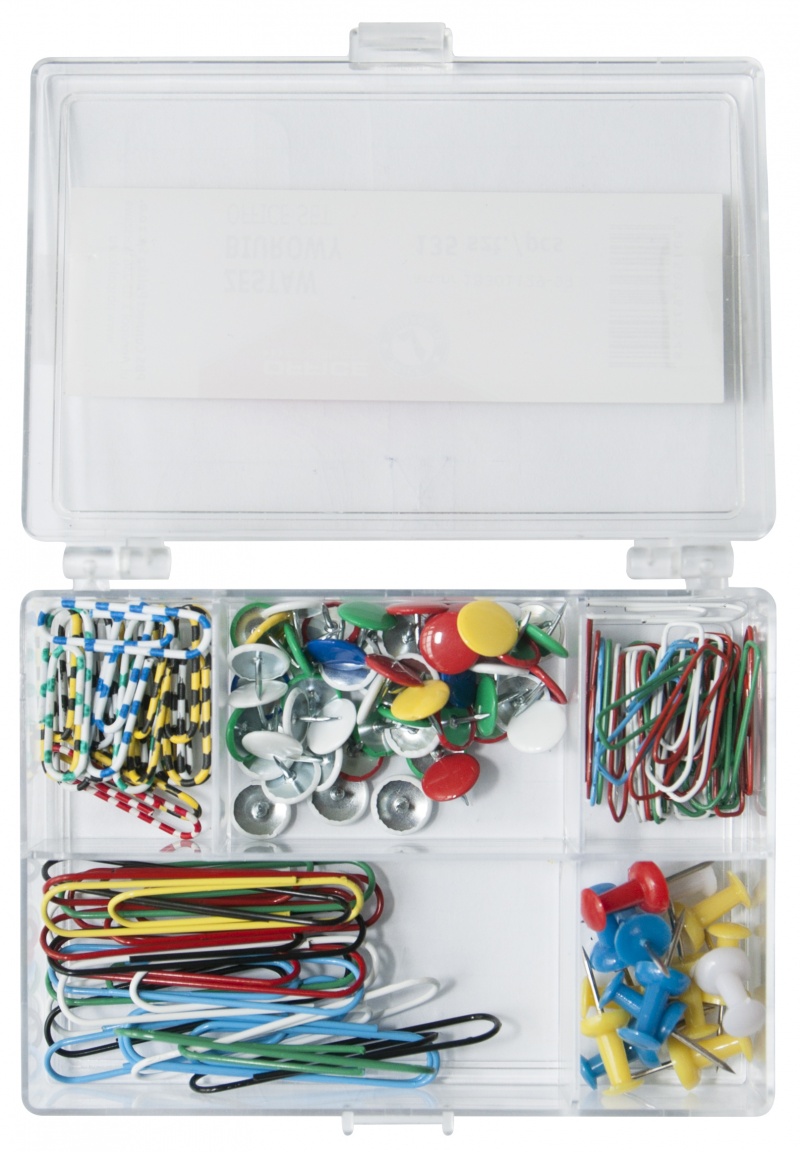 Sæt med clips, tegnestifter, elastikker i plastæske - 135 dele