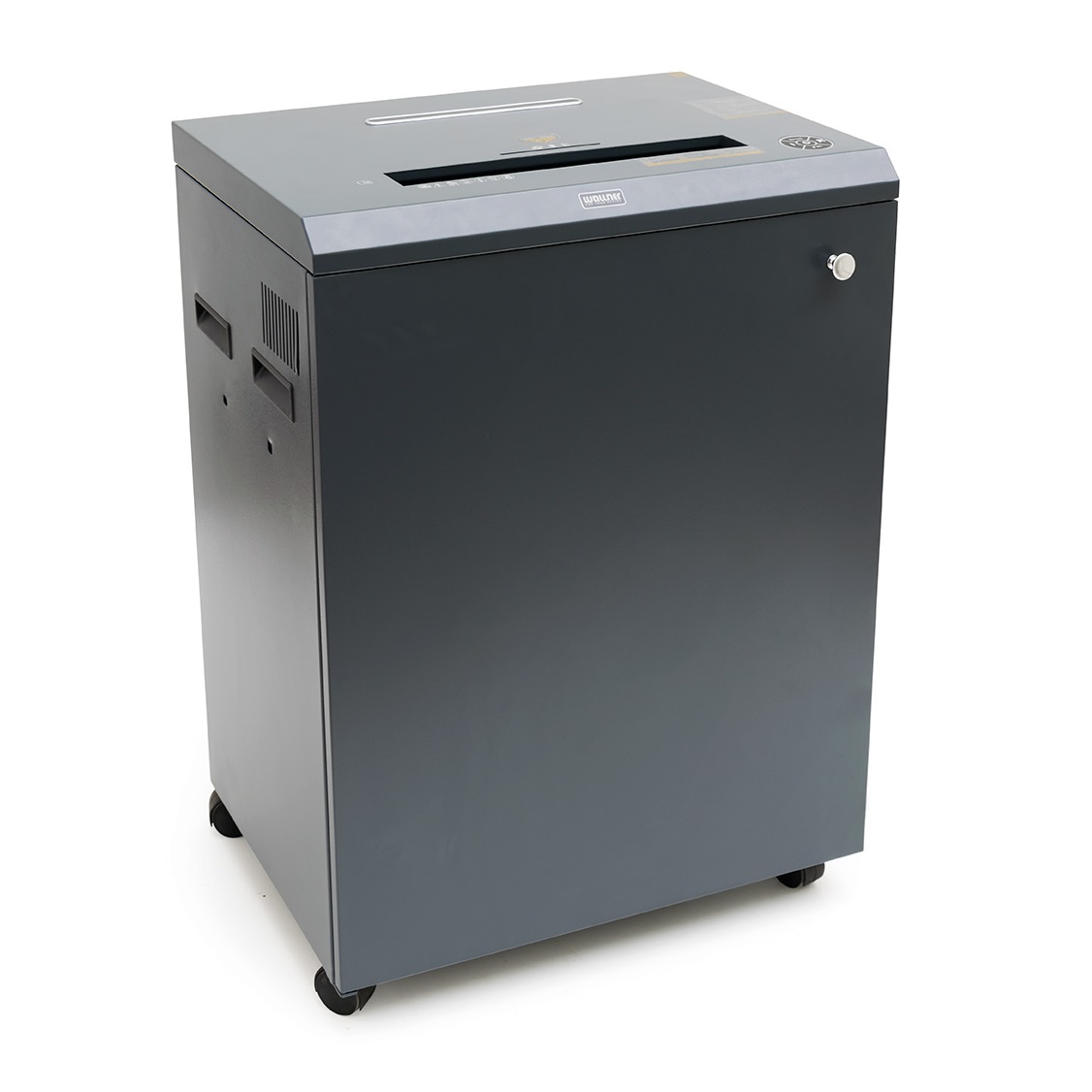 Suveræn makulator i metal kabinet. Ideel til mindre og store kontorer. Kraftig motor og kontinuerlig drift op til 30 minutter. Markulere op til 30 stk. A4 papir af gangen & kan også bruges til klammer, clips, CD/DVD & plastikkort. LED-display, som viser makulatorens tændte funktioner. Sikkerheds stopknap, i tilfælde af papirstop bliver dokumenterne automatisk trukket tilbage. Beskyttelse mod overophedning. Monteret på hjul for nemmere placering. Optisk beholderindikator. 120 ml olieflaske inkluderet.Funktioner:• Markulere op til 30 ark af gangen (80g)• Beholder: 80 liter• Max dokument bredde: 310 mm• Klippe str: 4 x 30 mm• Vægt: 70 kg• Mål: 895 x 520 x 385 mm• 2 års garanti
