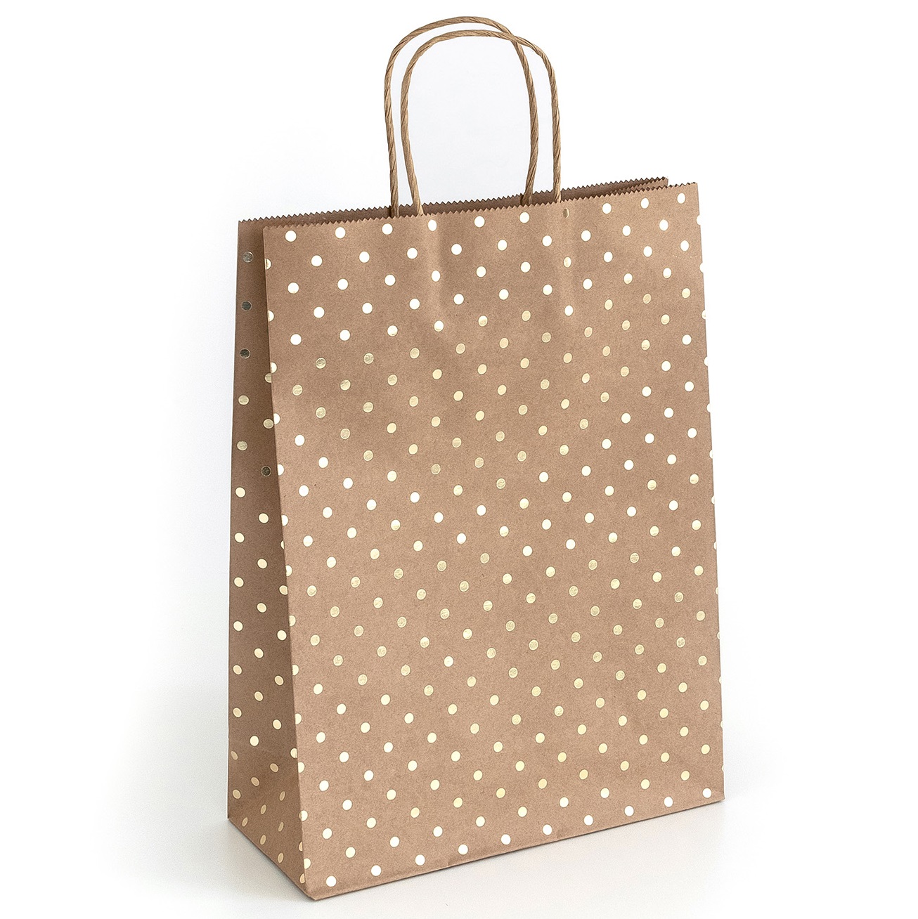 Smukke designposer med metalliserede guld dots. Perfekte poser til gaver til f.eks. et babyshower, en fest eller en barnedåb. Gaveposerne er lavet af papir, som hver især måler 33 cm i højden og 24 cm i bredden. Gaveposerne kan stå af sig selv og den snoede hank gør dem lette at transportere. Gør dagen endnu sødere med fine gaveposer og glæd fødselsdagsbarnet, den kommende mor eller forældreparret. Specifikationer• Antal i pakken: 5 stk.• Størrelse: 33 x 10 x 24 cm• Materiale: papir• Farve: mørk beige• Tryk: metalliserede guld dots