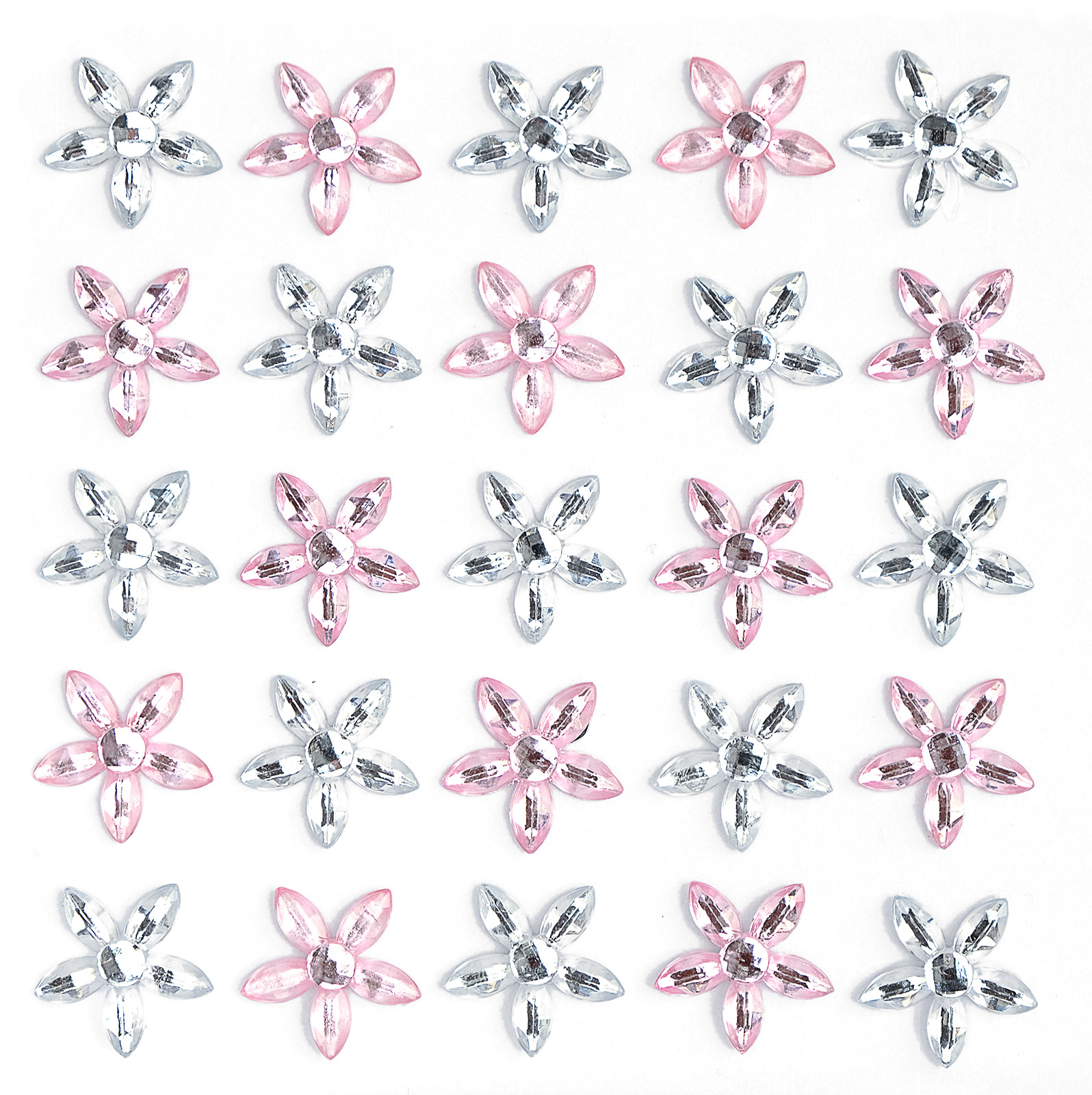 Smukke blomster rhinsten i sølv og pink. Selvklæbende bagside og facetslebet overflade. Perfekte til invitationskort, gavekort, æsker og utallige andre kreative dekorationer. 25 stk. pr. pakke.