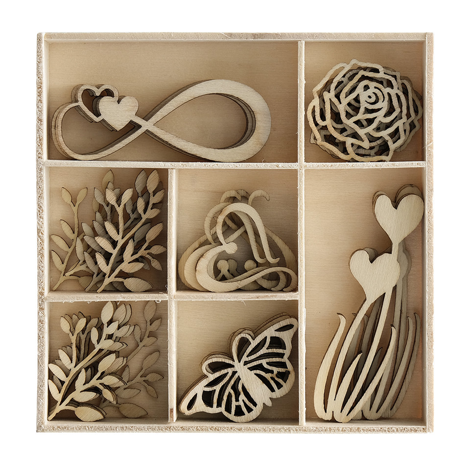 Søde hjerter og naturfigurer lavet af træfiner. Æsken indeholder 7 forskellige design med 5 stk. af hver. Perfekte til indbydelser, gaveæsker, bordpynt og masser af andre kreative ideer. Mål: 10,5 x 10,5 x 1,5 cm.