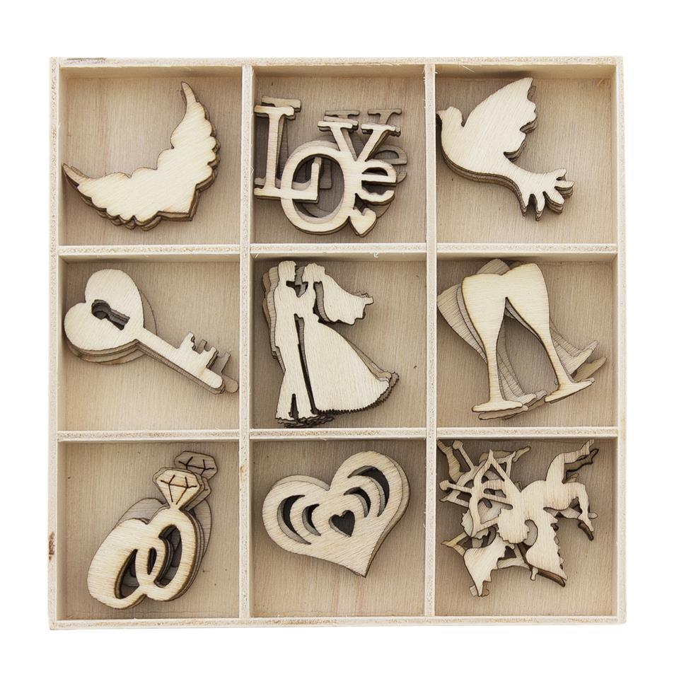 Træpynt bryllup - forskellige designs - 1 æske á 45 stk.