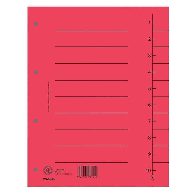 A4-faneblade i stærk karton er ideelle til at organisere dine dokumenter i mapper, brevordnere og ringbind. De 10 nummererede faner gør det nemt at opdele indhold i overskuelige sektioner. Det røde kartonforblad giver et professionelt udseende, og det er muligt at klippe fanerne til, så de passer perfekt til alle behov. Lang holdbarhed ved daglig brug og velegnet til både kontoret og hjemmet.• Størrelse: A4 - 235x300mm• Faner: 1 - 10• Materiale: karton• Passer til alle typer mapper• Antal i pakken: 100 stk