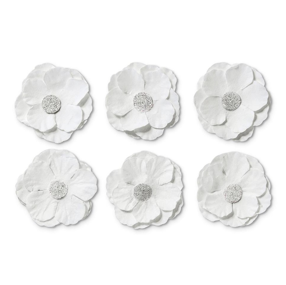 Hvide klematis papirblomster m. glitter selvklæbende 3cm, 6 stk.
