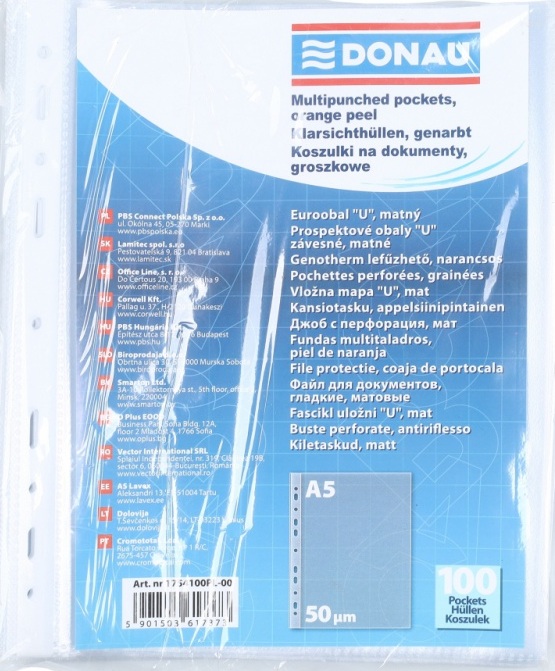 A5 plastlommer giver optimal beskyttelse mod skader og snavs. Med nem åbning i toppen er det nemt at indsætte og fjerne dokumenter hurtigt og effektivt. Vores plastiklommer i A5 størrelse er fremstillet af slidstærk, miljøvenlig polypropylenfolie med en god tykkelse på 50 mikron/my. Dette sikrer, at dine dokumenter forbliver beskyttede og i fremragende stand gennem en lang periode. Vælg vores produkt for optimal holdbarhed og bæredygtighed, der opfylder dine professionelle behov. Ideelt til både kontorbrug og privat opbevaring. A5 plastlommer måler 171x215mm og er det ideelle valg til kontoret, skolen eller hjemmet. Designet til effektiv opbevaring af mindre dokumenter i A5 størrelse forbliver beskyttede og organiserede. Med 100 plastiklommer pr. pakke, har du god plads til at bevare dine vigtige materialer. Invester i kvalitet og funktionalitet.• Velegnet til A5-dokumenter• Åbning i toppen• Materiale: Miljøvenlig polypropylenfolie• Forstærket kant• 9 huller• Antal i pakken: 100 stk