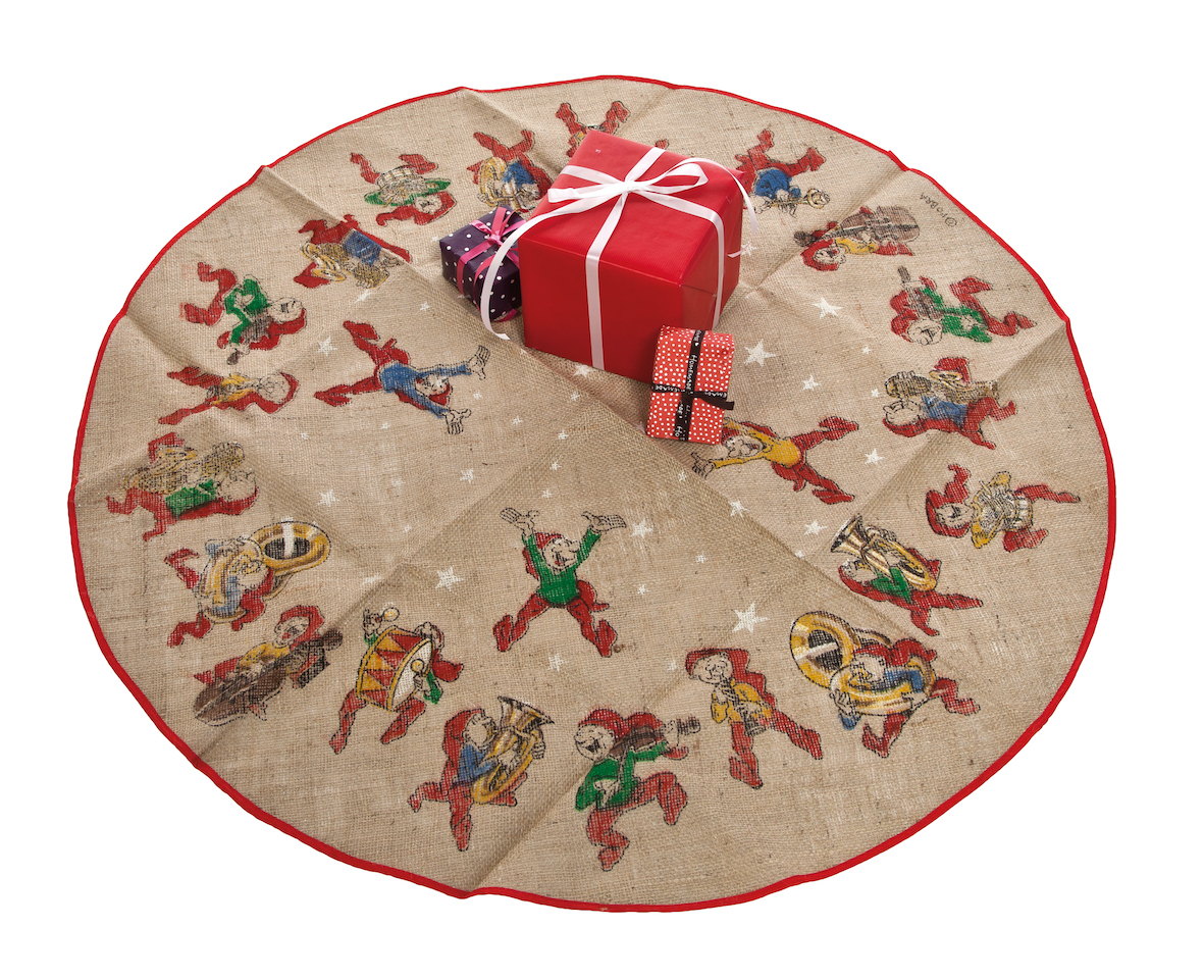 Stort juletræstæppe i hessian med rødt kantbånd og glade Brammingnisser. Måler 120 cm i diameter og er fremstillet i polyester. En hyggelig og nostalgisk base til dit juletræ, som skaber stemning og spreder smil under julegaverne.