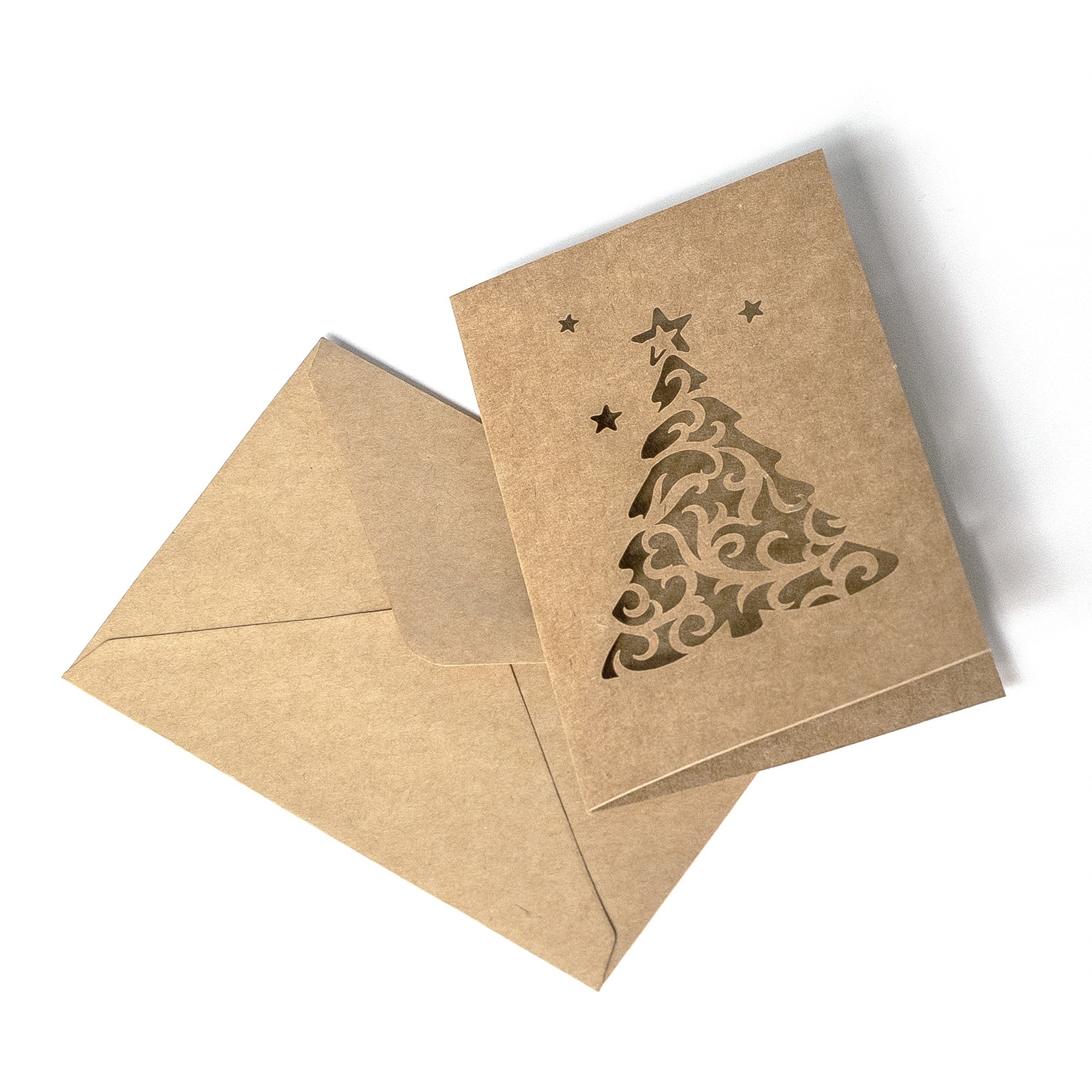 Kuvert + kort sæt 5 stk. med juletræ udskæring 70mm x 100mm