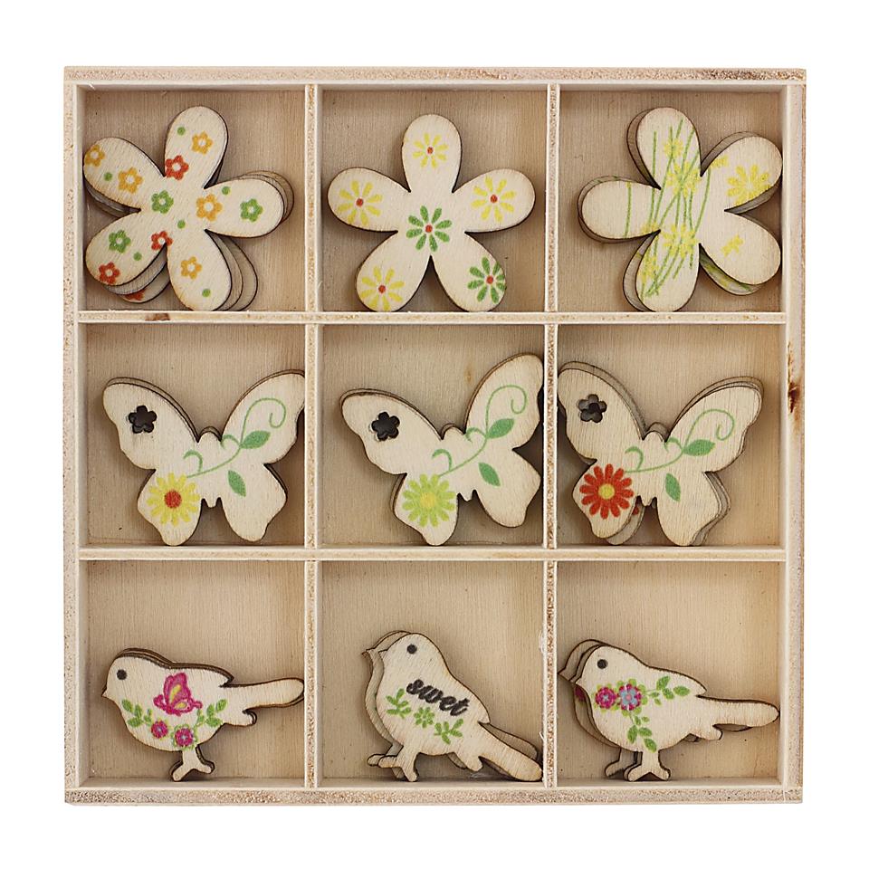 Træpynt fugle og sommerfugle - forskellige designs - 1 æske á 27 stk.