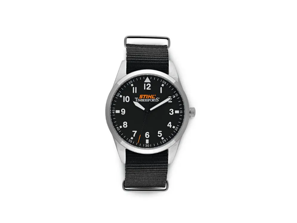 Med STIHL Timbersports ikoniske logo på urskiven er dette elegante herreur et "must have" for enhver STIHL-fan. Uret er produceret i samarbejde med Jacques Lemans. Urglasset er fremstillet af hærdet glas med en vandtæthed på 10 ATM, mens remmen er fremstillet i blødt nylon og kan justeres efter brugerens håndled. - Tilbehør/sikkerhed > Merchandise - STIHL - STIHL Timbersports armbåndsur STS sort/sølv