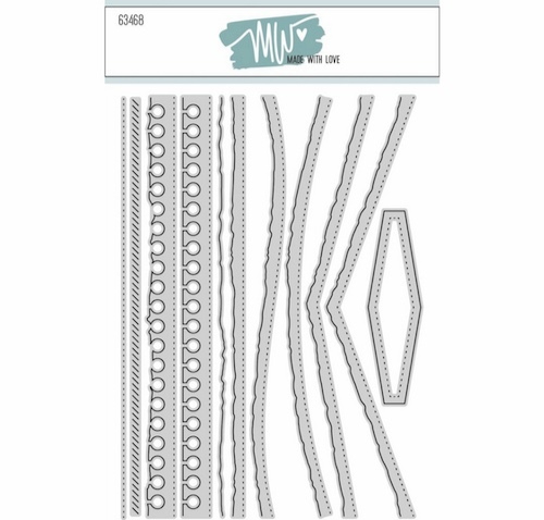 Edges fra Made With Love indeholder 11 dies - 2 effekt dies med syninger, 2 notebogs kanter, 6 afrevne kant dies med lige, buet og vinklet kanter og syninger og 1 label die (passer som lag til label i Sketches 3 (63403)).Kanterne er 15 cm lange.