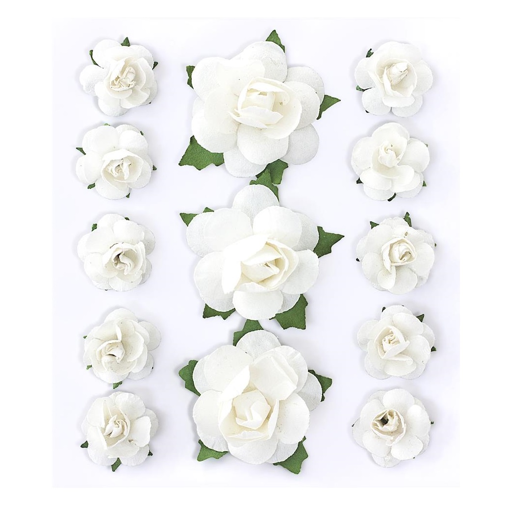 Smukke hvide rosenknopper med grønne blade. Velegnet til bryllup, bordpynt, fødselsdage, barnedåb, en romantiske aften og mange andre festlige lejeligheder. Blomsterne er lavet af papir og er selvklæbende, så du kan fastgøre dem på næsten alle overflader. Pakken indeholder 13 stk. og er ca. 1-3cm i diameter. Fåes også i andre farver.