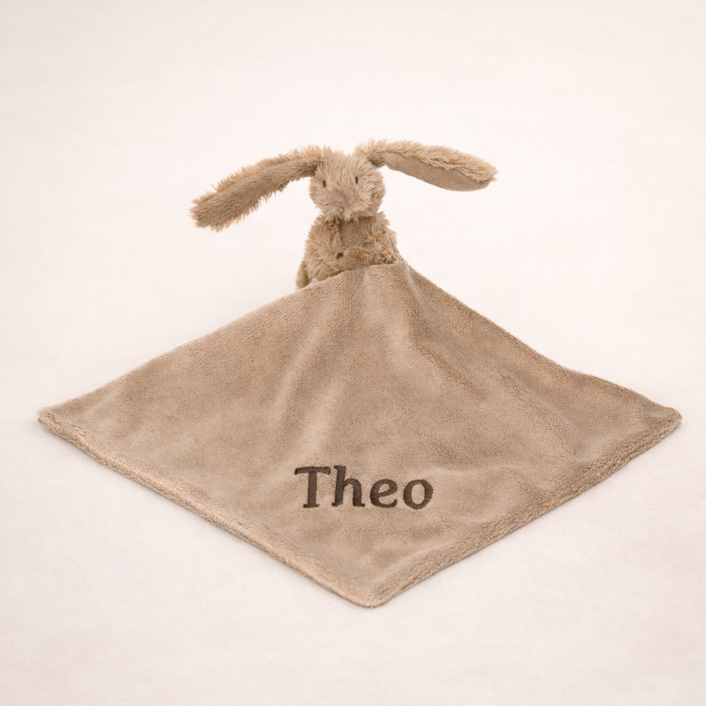 En blød og hyggelig nusseklud med Kaninen Richie. Mål cirka 28 x 28cm, fremstillet i polyester og designet som tryg ven til babytid og tidlig barndom. Vask ved 30 grader Vi broderer gerne barnets fornavn på nussekluden, du kan vælge mellem forskellige skrifttyper og farver.