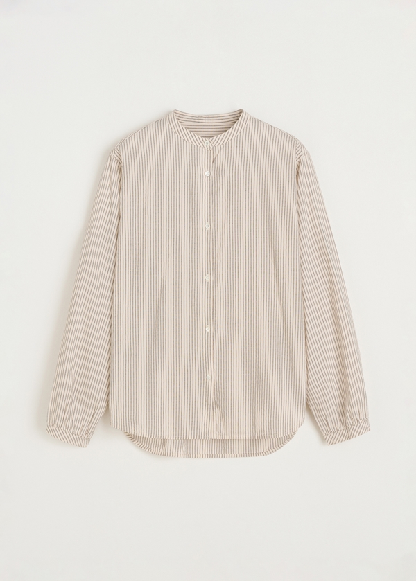 En feminin, kraveløs skjorte fremstillet af blød, ufarvet økologisk bomuld og vævet med kontrastfarvede striber. Designet i en regulær pasform med delikate perlemorsknapper, kurvet kantlinje og dekorative rynkedetaljer ved bærestykket og ærmerne, der skaber en elegant, voluminøs silhuet.