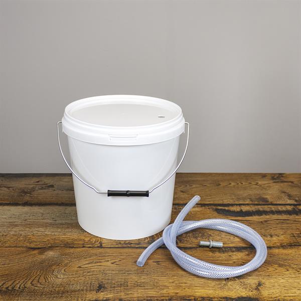 Tappespand med hank og låg forsynet med slange og tappestuds