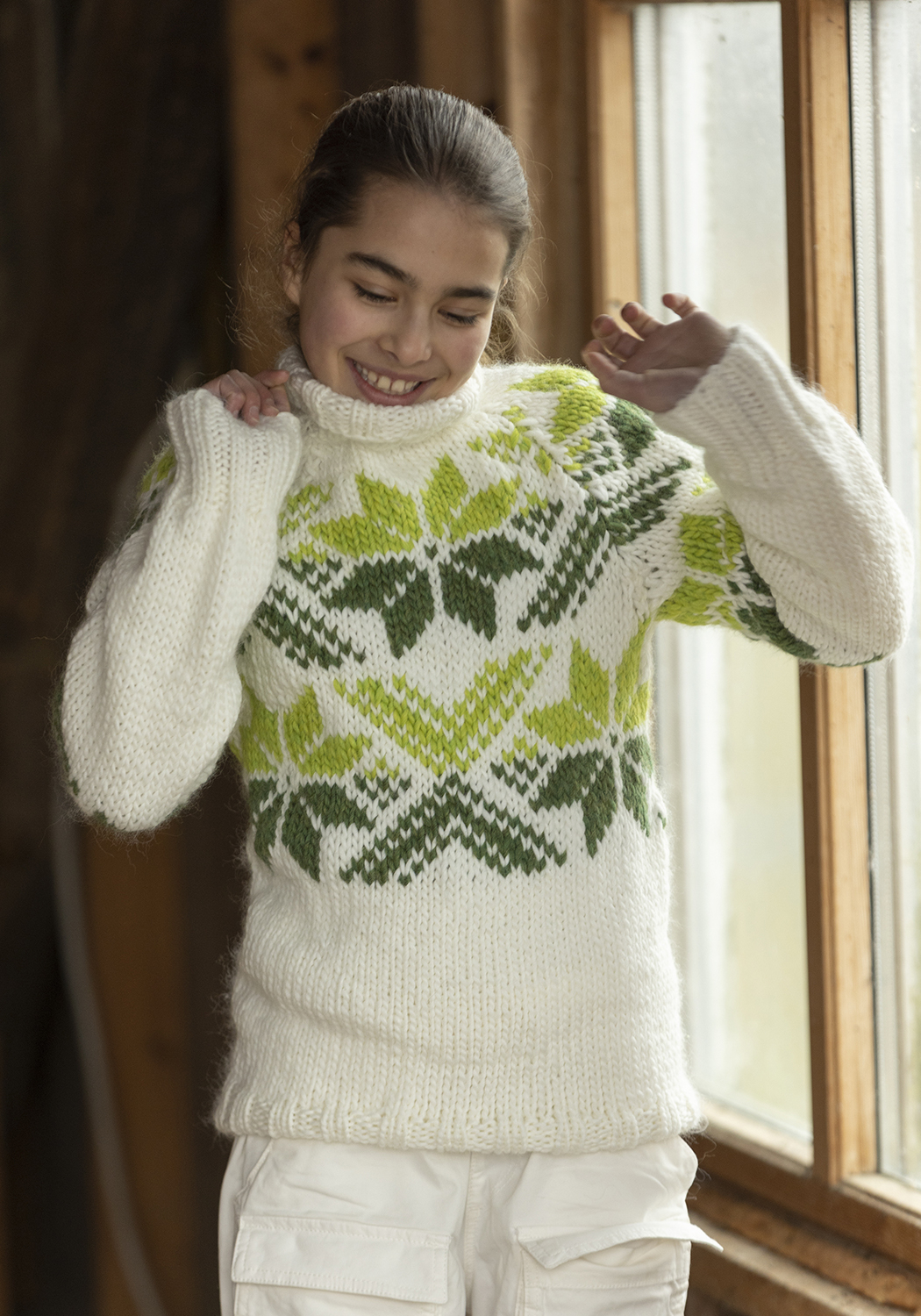 Se tilhørende garn længere nede på siden. Vælg størrelsen og få korrekt mængde garn til opskriften. Modellen er strikket nedefra og op "Sno" genser- Viking Design 2410-4A Kit - 4 - 12 år - Viking Snorre Indhold: 100% MerinouldAnbefalede rundpinde: 6 og 7 mm, længde afhænger af str. du strikkerStrikkefasthed (10 cm i bredden): 12m glatstrik på pinde 7 mmStørrelse: 4 - 6/8 - 10 - 12Overvidde: 67 - 73 - 80 - 87 cmHel længde: 40 - 47 - 54 - 58 cmÆrmelængde: 28 - 34 - 40 - 43 cmFoto: Studio Hjelm Viking snorre, er et lækkert tykt og blødt 100% Highland merinould fra Peru. Garnet kommer i 100g nøgler og kan bruges til skønne modeller til hele familien Garnet er ikke superwash behandlet, så det skal vaskes skånsom Kommer i en flot farvepalette