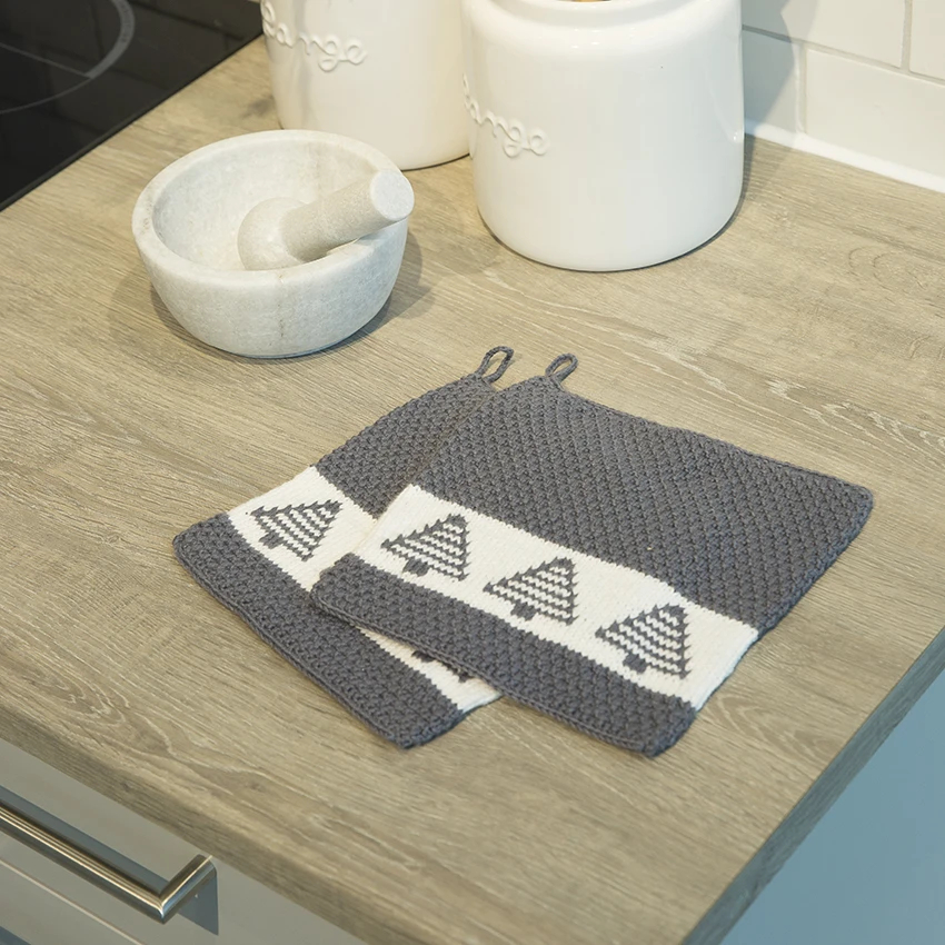 Se tilhørende garn længere nede på siden. Vælg størrelsen og få korrekt mængde garn til opskriften. Grydelapper grå juletræ - Viking Design 1715-19A kit - 20cm x 20cm - Viking Bjørk Kit: Strikkekit / HæklekitIndhold: 50% Bomuld og 50% bambusAnbefalede pinde: 3 mm rundpindAnbefalede hæklenåle: 3 mmStrikkefasthed (10 cm i bredden): 25m glatstrik på pinde 3Størrelse: 20 cm x 20 cmFoto: Studio Hjelm