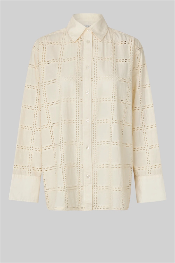 Smuk skjorte fra Second Female fremstillet i blød bomuld med dekorativt cutwork-broderi i firkantet mønster, der giver et let og feminint udtryk. Modellen har klassisk krave og gennemgående knaplukning foran.