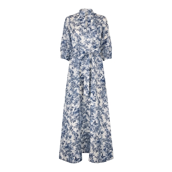 SalmaDEA Kjole fra Dea Kudibal er en smuk, gulvlang kjole i let hør, dekoreret med smukke botaniske motiver i blå, der giver et feminint og eksklusivt udtryk. Den har et regular fit, som let kan formes i taljen med det medfølgende bindebælte. Kjolen har de skønneste ballonærmer, der tilføjer et feminint udtryk. Kjolen leveres med underkjole for ekstra komfort og et smukt fald. En perfekt kjole til både sommerens begivenheder og særlige anledninger.