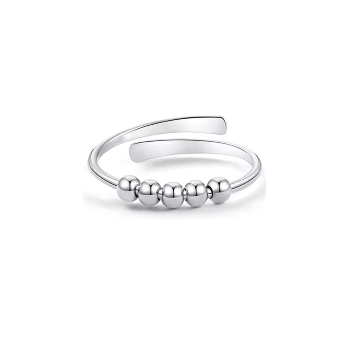 Smuk fingerring, der kan hjælpe urolige og rastløse hænder til at få afløb. Fingerringen er i et minimalistisk design med 5 perler og flade ender, der bliver bredere, så perlerne ikke kan smutte af. Selve ringen er sølvfarvet. Perlerne kan dimses med både når ringen sidder på fingrene, eller man kan tage ringen af og sidde og dimse med. Den er super diskret, så ingen vil tænke over, at den er en fingerring med særlige egenskaber. En elegant fidget til dig, der ikke ønsker, at det ligner et legetøj. Ringen kan hjælpe til at give ro ved angst, nervøsitet og uro. Den kan hjælpe på koncentrationen, når man sidder i skolen, til foredrag, i biografen og andre steder, hvor man skal sidde stille i længere tid. Den vil også kunne afhjælpe meget tydelige stims, hvis man ønsker at stimmingen skal være mere diskret. Materiale: Kobber Størrelse: fra 4,6 - 6,6 cm i omkreds
