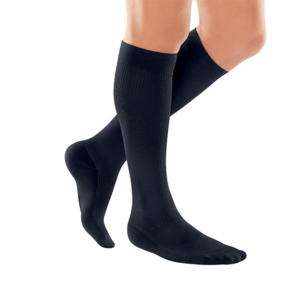 Støttestrømpe, velegnet som rejsestrømpe ved flyrejser og lange køreture Kontrolleret tryk der aftager fra hæl og op ad benet Kan reducere risikoen for blodpropper i benene