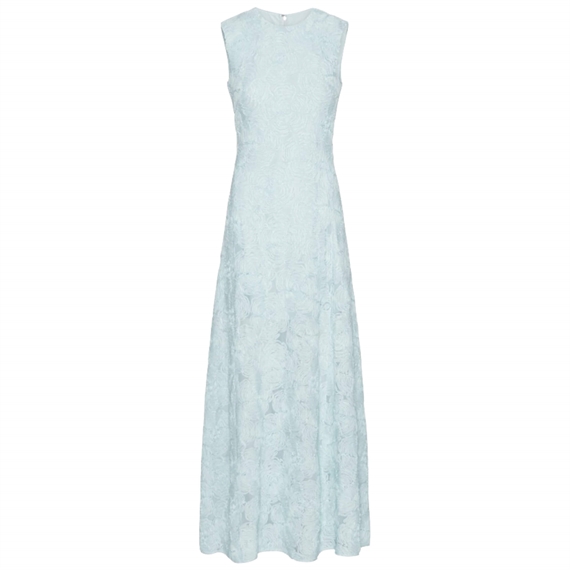 Den smukke Mesh Maxi kjole er en ærmeløs maxikjole med rund halsudskæring og en figursyet talje, der smukt fremhæver silhuetten og falder ud i en let, svajende nederdel. Kjolen har en struktureret mesh-overflade med et floralt mønster, som giver et elegant og levende udtryk med flot dybde. En diskret lynlås i ryggen fuldender det rene design.