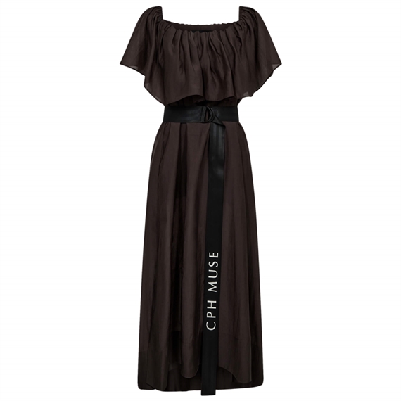 Smuk og feminin kjole fra Copenhagen Muse i en flot mørkebrun farve. CMMOLLY kjolen har en let og luftig pasform med feminine flæsedetaljer ved skuldrene, som giver et elegant og sommerligt udtryk. Den brede kontrastbælte i sort fremhæver taljen og tilføjer et moderne twist til det enkle design.