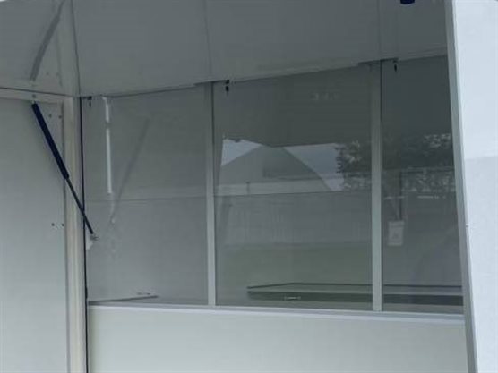Plexiglas til salgsåbningen i flere sektioner – giver fleksibel åbning, bedre styring af kø og mulighed for at lukke af mod vind og vejr. | Plexiglas f. salgsåbning Aeroline 301 salgsvogn | Reservedele og tilbehør > Ekstra udstyr til salgsvogne
