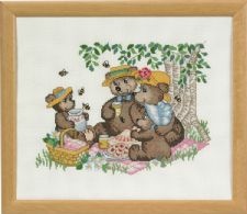 Broderi billede 32 x 27cm bjørnefamilie på skovtur, stof ecru aida 6,4 tern pr. cm.