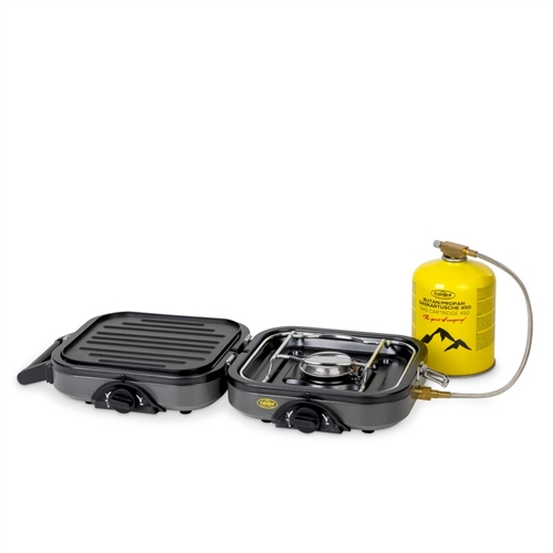 • Inkluderet i pakken: komfur, 2 gryderister, grillplade, gasslange