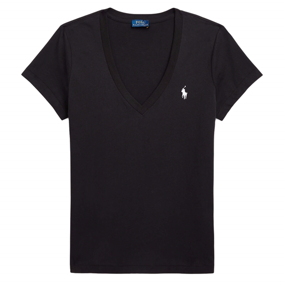 Lækker sort v-neck t-shirt fra Polo Ralph Lauren med hvid pony broderi på brystet. Den fine jersey t-shirt kommer i bomuld og føles derfor lækker blød at have på! En t-shirt du vil elske at have i garderoben!