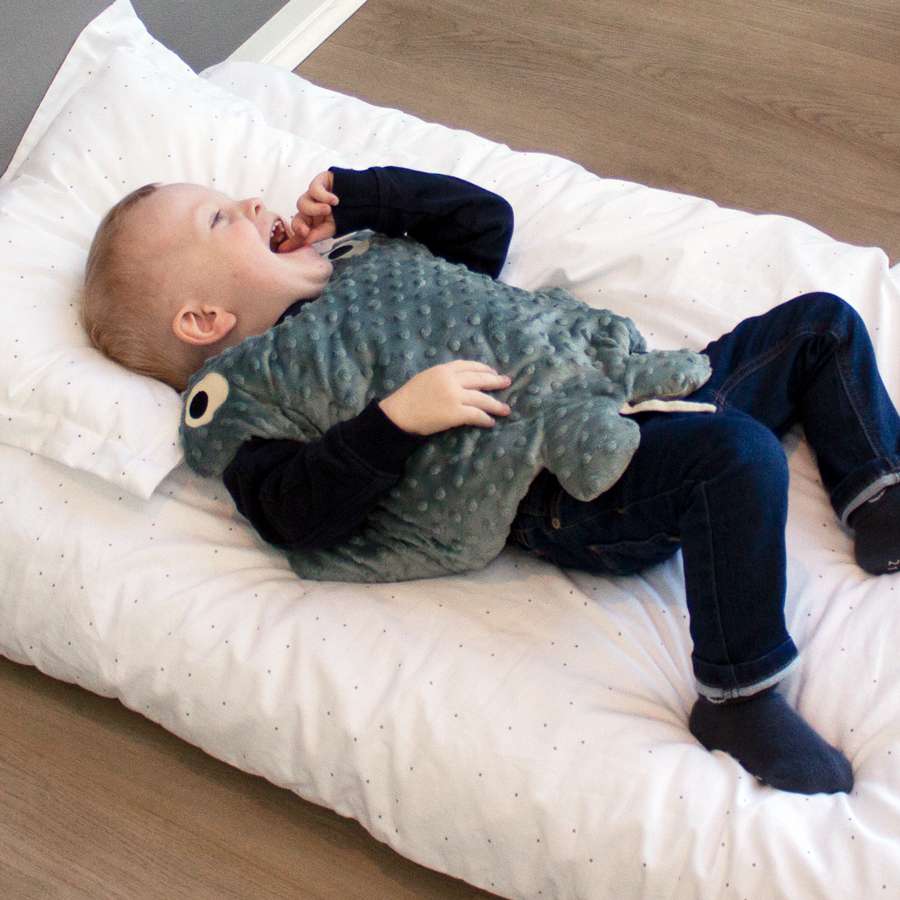 Kramme-rokken Manta er et vægttæppe, som hjælper mindre børn med at finde ro ved sengetid Hjælper barnet med at finde ro og sove Til børn med uro i kroppen/hovedet Afhjælper sansemæssig overstimulering Giver ro og tryghed Stimulerer børn til at mærke sig selv Rokken Manta vejer 1,2 kg Mål: 44 cm x 54 cm Overfladen 100% polyester Fyld 100% Pholyethylene Undersiden 55% hør og 45% bomuld Kan vaskes ved 30 grader. Anbefalet alder fra 1 til 3 år Manta er et lille sansemotorisk tæppe med tyngde, som lægges oven på barnet med vingerne godt tilsluttet til kroppen. Manta hjælper med at give barnet ro, tryghed og nærvær under indsovningen. Sansetæppet kan også bruges til små pauser i løbet af dagen, hvis barnet trænger til ro. Det sansemotoriske vægttæppe kan bruges mange steder, som f.eks. i vuggestuen/dagplejen, børnehaven eller hjemme i sofaen. Vægttæppet kan holde til at blive foldet sammen og puttes i en taske, hvis det skal med på besøg eller på weekend ophold. Når barnet er faldet i søvn, kan rokken igen fjernes. Hold altid øje med barnets vejrtrækning, da brug af tyngdetæpper kan virke forskelligt på børn. Manta er ikke vild med at blive bidt, da tænder er meget skarpe, så gå altid Manta igennem for huller inden brug. Oversiden på rokken er fyldt med små superbløde bobler, som stimulere den taktile sans hos barnet, når deres fingrer røre ved rokken. Manta kan let vaskes ved 30 grader og tørre hurtigt hængende. Så vask ham om morgenen og han er klar til sovetid. Rokken Manta er testet i henhold til legetøjsforordningen EN71-1-2-3 og lever op til alle krav og standarder for legetøj. Du er altid velkommen til at ringe eller skrive og booke tid i vores showroom, til at mærke og se de forskellige bamser og dyner med vægt, samt vores dimseting. Lille Manta HMI-nr. 122922
