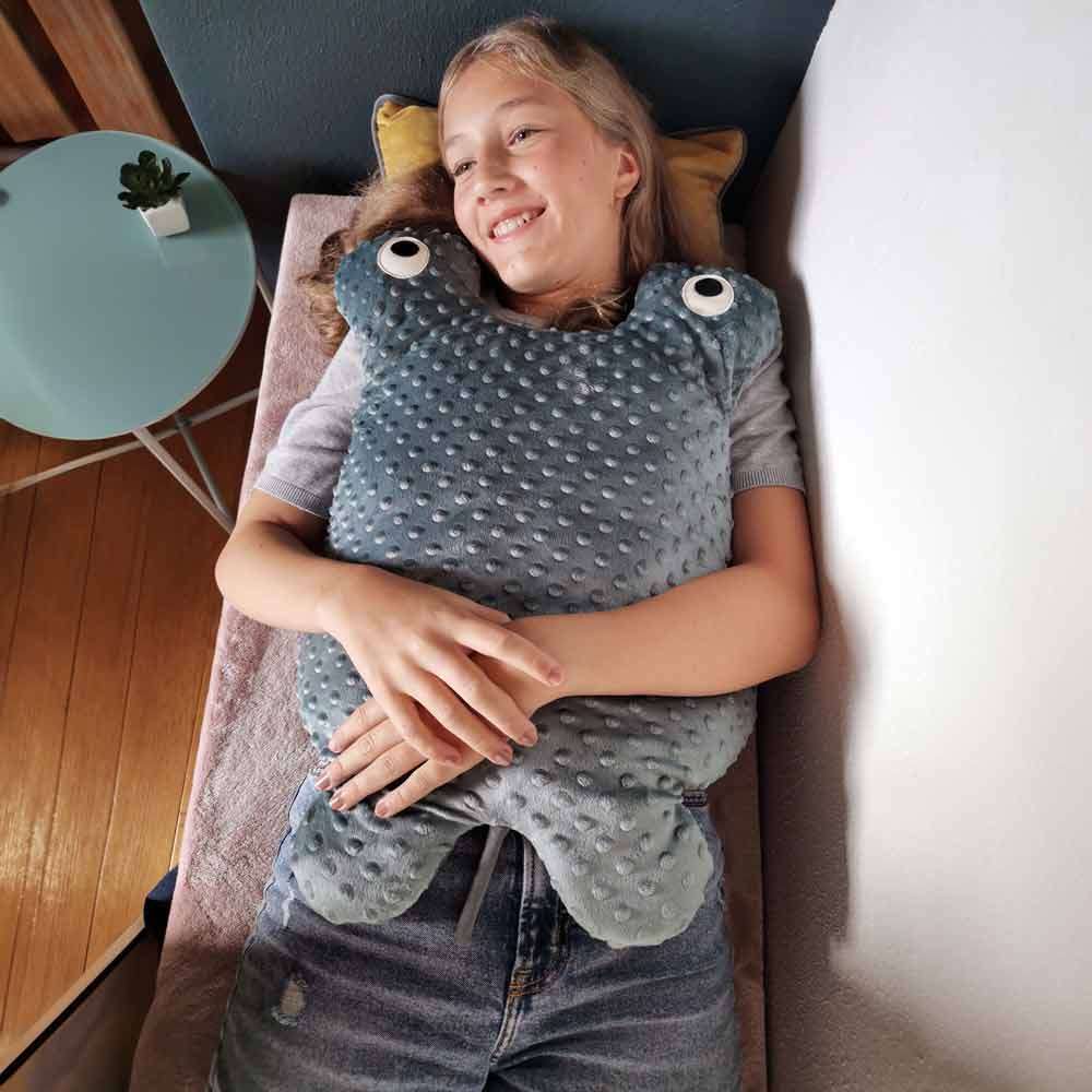 Et sansemotorisk vægttæppe som hjælper børn og ældre, med at finde ro i løbet af dagen eller ved sengetid. Hjælper med at finde ro og sove Til børn og voksne med uro i kroppen Afhjælper sansemæssig overstimulering Giver ro og tryghed Stimulerer børn og voksne til at mærke sig selv Det sansemotorisk tæppe med tyngde, er et stort vægttæppe i den lette ende på 2,9 kg. Med dets tyngde er den særlig god til større børn og til voksne, som har svært ved at falde til ro i sin seng og til demente, som mangler ro og tryghed i løbet af dagen eller ved indsovningen. Tæppet er formet som en rokke, der kan lægges oven på brystet, med vingerne godt tilsluttet til koppen. Rokken Manta hjælper med at give ro i kroppen, tryghed og nærvær under indsovningen. Sansetæppet kan også bruges til små pauser i løbet af dagen og særligt til urolige ben. Det sansemotoriske vægttæppe kan bruges mange steder, som f.eks. hjemme, i institutioner og på ældrecentre. Vægttæppet kan holde til at blive foldet sammen og puttes i en taske, hvis man har brug for at have det med sig. Hold altid øje med vejrtrækning hos den som bruger et vægttæppe, da brugen af tæpper med tyngde kan virker forskelligt på os. Oversiden på rokken er fyldt med små superbløde bobler, som stimulere den taktile sans, når fingrene røre ved tæppet. Manta kan let vaskes ved 30 grader og tørre hurtigt hængende. Rokken Manta vejer 2,9 kg Måler 59 cm x 53 cm x 4 cm Overfladen 100% polyester Fyld 100% Pholyethylene Undersiden 55% hør og 45% bomuld Kan vaskes ved 30 grader. Anbefalet til børn fra 3 år, voksne og ældre med demens Sanse tæppet er testet i henhold til lovgivningen, så der ikke er nogen skadelige kemikalier i produktet. Stor HMI-nr. 125537
