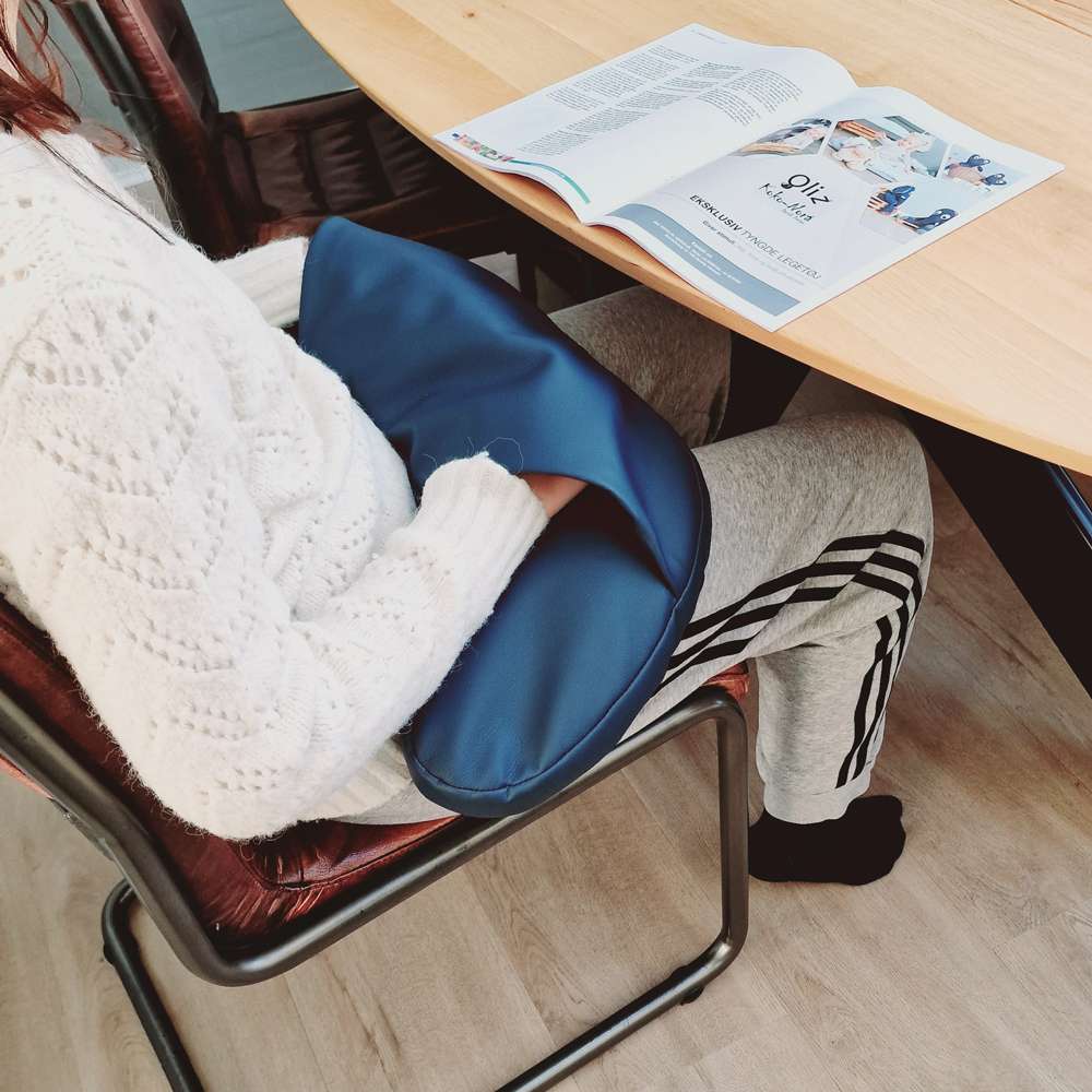 Har dit større barn udfordringer med at mærke sig selv i løbet af dagen? Mange børn oplever både motorisk uro og koncentrationsbesvær. Det kan være særligt slemt i skolen, ved middagsbordet eller i andre situationer, der kræver, at barnet sidder stille og koncentrerer sig om den opgave, de har foran sig. Fx at spise morgenmad eller løse en matematikopgave. Der findes dog hjælpemidler, der kan være med til at skabe ro i kroppen - bl.a. den sansemotoriske lårpude Maya. Lårpuden har en god tyngde, hvilket stimulerer sanserne og skaber ro på kroppen i tilfælde af fx motorisk uro. Kugler stimulerer den taktile sans Den store Maya lårpude har ikke kun en tyngde, der giver ro på kroppen. Den har også to lommer med gemte kugler i. Barnet kan her tage sine hænder i lommerne og bevæge kuglerne, hvilket stimulerer den taktile sans. Der er mange situationer i løbet af dagen, hvor dit større barn skal koncentrere og fordybe sig. Både i skolen og derhjemme. Her er kuglerne og lårpudens tyngde med til at forbedre barnets koncentrationsevne, så han/hun kan samle sig om en fælles besked eller en skoleopgave. Derfor er lårpuden med til at: - Give ro til rastløse arme og ben - Mindske koncentrationsbesvær - Styrke den taktile sans. Det er ikke kun større børn, der kan have gavn af Maya i den store version. Personer med demens med uro i ben og fingre kan også bruge lårpuden til at skabe ro og mindske motorisk uro. Skabt til børn over 12 år Lårpuden Maya fra Oliz kommer i tre størrelser. Maya stor er den største i rækken med sin vægt på 5 kg og en bredde på 65 cm. Derfor anbefales den til børn i alderen 12 år og opefter. Maya Mini: 40 x 5 x 15 cm (1,5 kg) Maya Lille: 50 x 5 x 17 cm (3 kg) Maya Stor: 65 x 5 x 17 cm (5 kg). Målene er angivet i bredde x højde x dybde i cm. Lårpuden Maya er lavet i imiteret læder og er derfor super nem at rengøre. Det gør den også god at bruge i spisesituationer - husk dog altid at vende lommerne nedad.