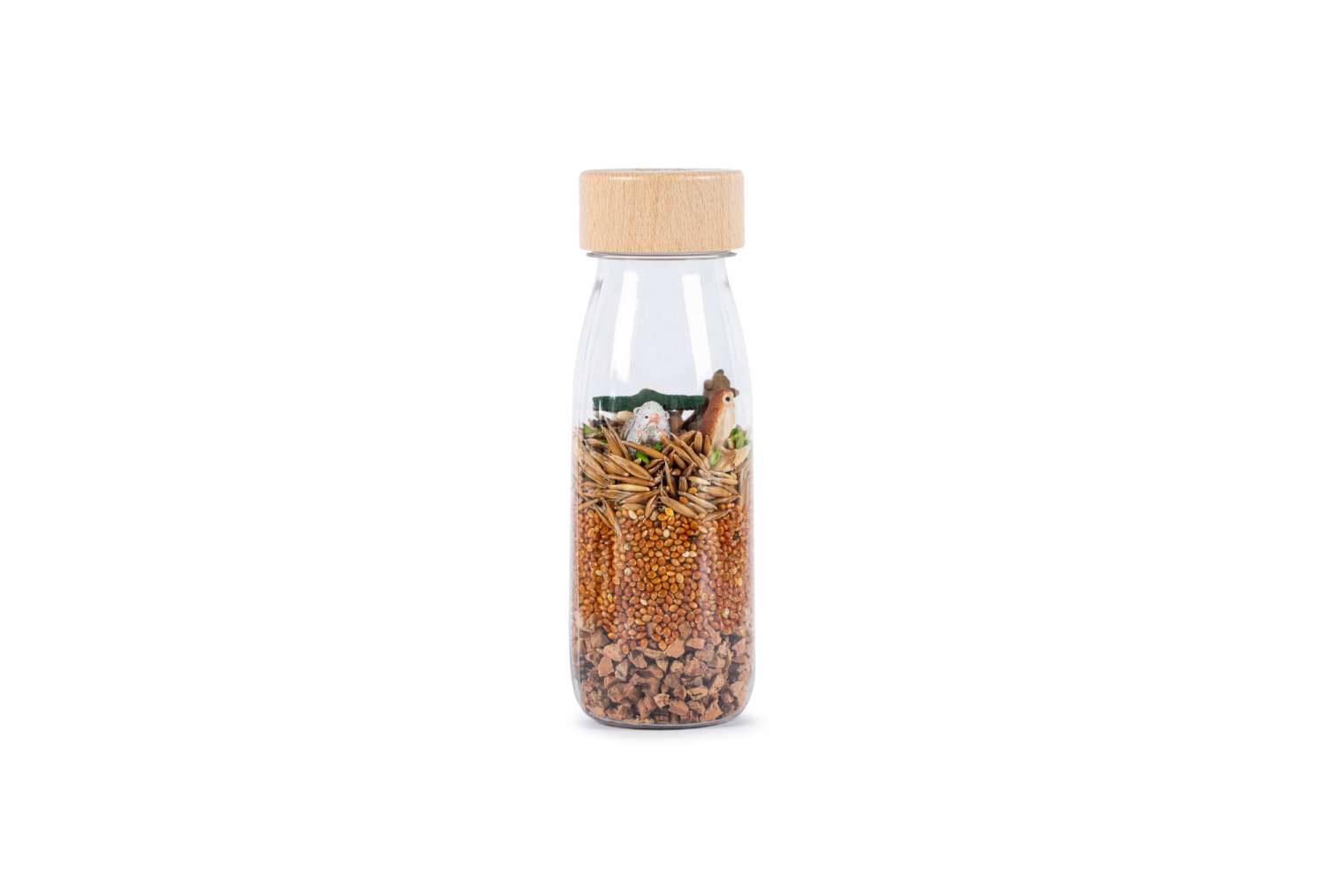 Led og du skal finde! Tag på opdagelse i skovbunden og se, om du møder nogle af skovens søde dyr. Lyt og hør hvordan det rasler, når du vender og drejer flasken din søgen efter pindsvinet, ræven, uglen, kolibrien, ulven eller hjorten. Se, ryst og find! Dejligt intuitivt og helt uimodståeligt. De små objekter i flasken giver både en skøn lyd og de er sjove at kigge efter. Flasken giver demed både visuel og auditiv stimulering. Ryst den forsigtigt eller hårdt for at høre forskellen, eller tril den på gulvet for at opleve lyden på en helt tredje måde. Lidt fakta om sanseflasken fra Petit Boum: Størrelse: 4 cm x 14 cm. Materiale: prop af træ og flaske af hård plast. Læg dem ikke i vand. Tør dem af med en fugtig klud, hvis de bliver beskidte. Lad dem ikke ligge i solen i længere tid. Kan bruges fra 3 mdr. producenten anbefaler 18 mdr.