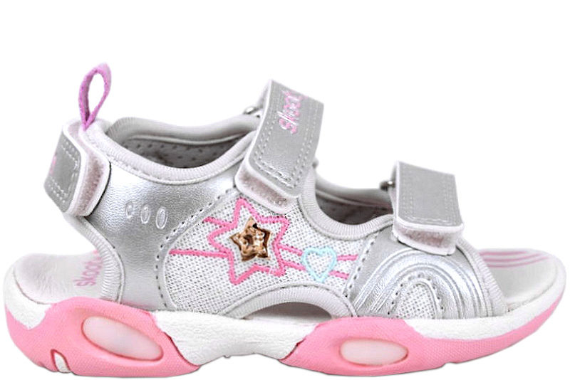 SKOOTY. Rigtig smart sandal fra Skooty. Sandalen er lavet i sølvfarvet PU. Skoen er med tre velcroremme, to over foden og en på hælen, så den kan spændes godt ind til foden. På ydersiden er der en stjerne og et hjerte. Sandalen er med en lyserød og hvid mellemsål med lys der blinker, når man går. Sandalen er med en grå og lyserød slidsål. Indvendigt er skoen foret med grå tekstil. Sandalen har en lyserød dæksål, der er rigtig blød at gå på. .. Læs mere på https://www.juul-sko.dk/boernesko/boerne-sandaler/piger118/skooty-10194-str27.htm