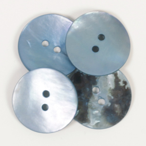 Knappen er cirkelrund med to huller til påsætning i midten. Farven er blå med grålige nuancer, som gør den nærmest måneblå. Dette er en super flot knap.