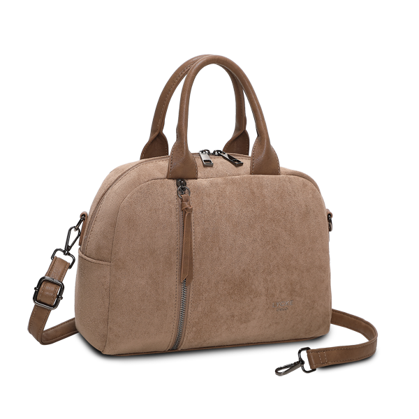 Lycke Oslo Carina håndtaske – trendy bowlingtaske i sandfarvet kunstlæder Lycke Oslo Carina er en stilfuld og trendy håndtaske i klassisk bowlingmodel. Tasken er fremstillet i flot kunstlæder med en blød struktur, som giver et elegant og moderne look, der passer perfekt til både hverdag og pænere brug. Den dekorative frontlynlås giver tasken et ekstra stilfuldt udtryk og tilføjer samtidig praktisk opbevaring. Tasken kan bæres i hånden eller på armen med de solide håndtag, men også komfortabelt som crossbody med den aftagelige og justerbare skulderrem. Hovedrummet lukkes sikkert med lynlås og giver god plads til dine daglige nødvendigheder som mobil, pung, nøgler og små accessories. Indvendigt finder du en praktisk lynlåslomme samt et åbent rum, der gør det nemt at holde orden i dine ting. På fronten sidder en praktisk lynlåslomme på 20 cm, mens bagsiden har en ekstra lynlåslomme på 15 cm, så du hurtigt kan få adgang til dine vigtigste ting. Lycke Oslo Carina er en veganvenlig taske, der kombinerer funktionalitet med et stilrent design. Den sandfarvede tone gør den nem at style til både lyse og mørke outfits. Bestil Lycke Oslo Carina håndtasken i dag og få en elegant hverdagstaske med hurtig levering. Se hele udvalget af tasker fra Lycke her. Specifikationer • Produkttype: Håndtaske / bowlingtaske • Serie: Carina • Materiale: Kunstskind • Metaldele: Gunmetal (blank mørkegrå) • Håndtags drop-længde: 11 cm • Justerbar og aftagelig skulderrem • Regulerbar skulderrem: 33 – 68 cm • Hovedrum med lynlås • Indvendig lynlåslomme • Åben indvendig lomme • Frontlomme med lynlås (20 cm) • Bagside lomme med lynlås (15 cm) • Veganvenlig • Længde: 28 cm • Højde: 21 cm • Bredde: 11 cm • Farve: Sand / lysebrun • Artikelnummer: 8061506 • EAN: 7321051182235
